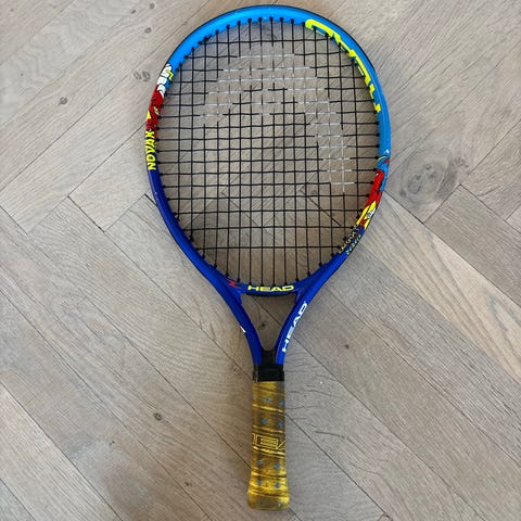 Flot og farverig ketcher til juniorspillere. Ketcheren har tydelige slidtegn i kanterne efter almindelig brug, men fungerer som den skal.