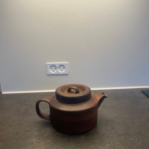 Tekopannu tekanna i rød støbejern med mønstret overflade og sort håndtag. Tekanden har et låg med knap og en rund form. Den er egnet til brygning af te og har en robust konstruktion.