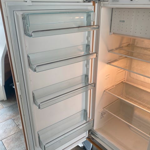 Der er en stor grøntsagsskuffe med glidebeslag + fast beslag til en hylde.