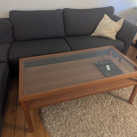 Sofabordet med glasplade og marmorplade under glasset ben i Teaktræ