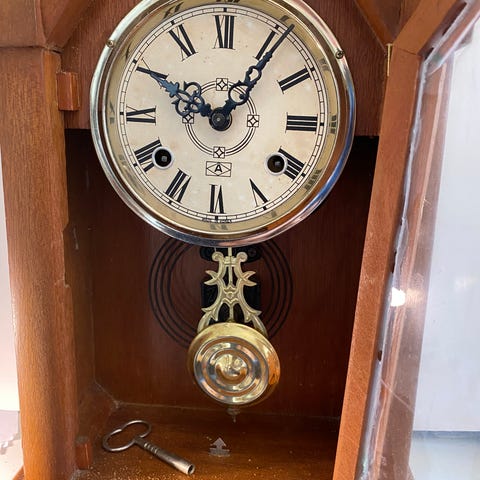 Vægur, i Trækasse 1920-30, Vægur i mintgrøn trækasse, uret er ikke testet mangler nøgle, pendulet bliver pakket seperat