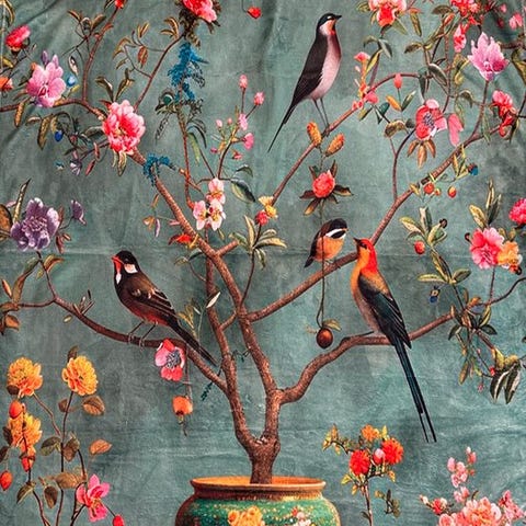 Eksklusiv stof med Upupa og småfugle, Guld, Art nouveau - 600x140cm - Artmais...