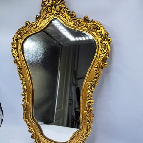 Vintage spejl fra Spanien, diameter 65 cm, af glas og kobber, i god stand med mindre tegn på slid. Klik på den blå "gå til varen" knap, for at købe eller byde på denne vare. Den samlede pris vil blive vist inden du afgiver dit bud.