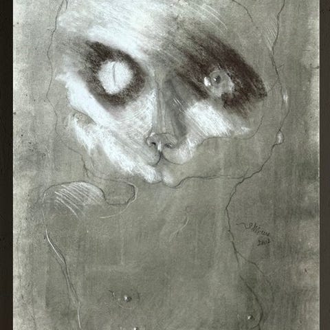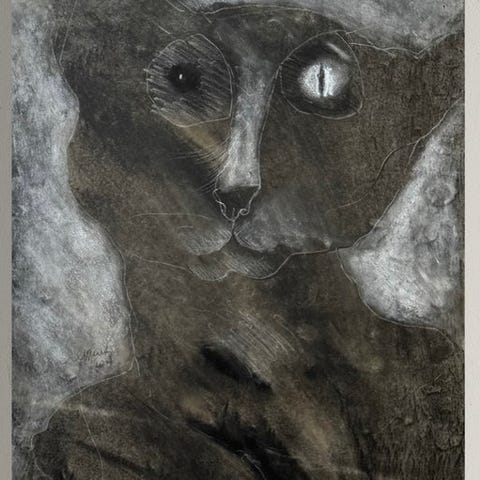 Udført i 2005 tilhører dette værk med titlen Mågekatten serien 'Les Chats de Robert Detheux', en væsentlig figur i belgisk surrealism. Gennem sin eteriske tegning og dybden i sit blik illustrerer det kunstnerens evne til at fremkalde tilstedeværelse ud fra stilhed og diffust lys.