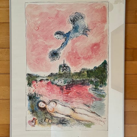 Dette plakats billede viser mesterligt Chagalls karakteristiske poetiske, drømmende og farverige billedsprog. Samarbejdet mellem Chagall og Galerie Maeght