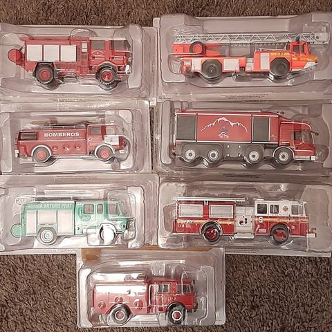 Syv røde støbt metal brandbiler i blisteremballage, verdensbrandbiler-samling, skala 1:43, ny og i originalt forseglet æske. Klik på den blå "gå til varen" knap, for at købe eller byde på denne vare. Den samlede pris vil blive vist inden du afgiver dit bud.