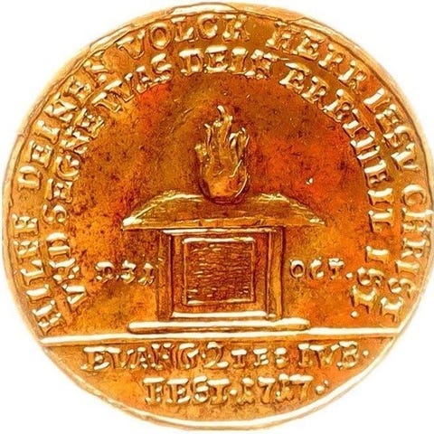 Tyskland, Sachsen-Coburg-Saalfeld, en guldd 12-ducat-medalje præget i 1767 med stempel af Johann Veit Riesing, der fejrer den protestantiske teolog Erdmann Rudolph Fischer (1687–1776)’s 80-års fødselsdag og 50-års præstejubilæum i Coburg, præsenteret af hertug Ernst Friedrich (1764–1800); diameter 42,0 mm, vægt 41,29 g, guld, ikke certificeret. Klik på den blå "gå til varen" knap, for at købe eller byde på denne vare. Den samlede pris vil blive vist inden du afgiver dit bud.