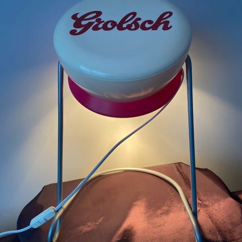 Grolsch lampe med bøjlestøtte, fra Nederlandene, af aluminium og plastik, estimeret periode 1990–2000, i god stand og i funktion, med én fatning, størrelse 25 × 23 × 35 cm, vægt 1 kg. Klik på den blå "gå til varen" knap, for at købe eller byde på denne vare. Den samlede pris vil blive vist inden du afgiver dit bud.