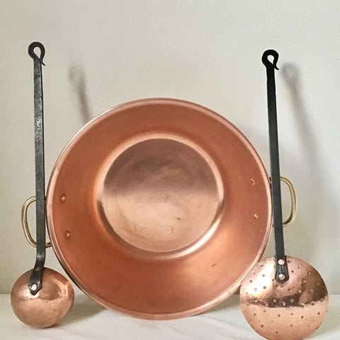 En kobberkande med skummeske til at lave marmelade eller syltetøj.