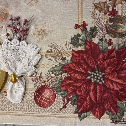 Vidunderligt borddække til 12 personer i værdifuld San Leucio-silke, smukt broderet med flerfarvede blomster på en fantastisk rød baggrund!