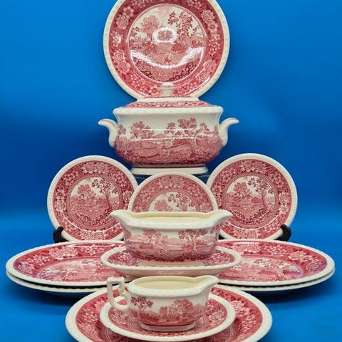 Til salg står et omfattende kaffestel fra den berømte serie „Rusticana“ fra Villeroy & Boch Mettlach. Servicen viser det karakteristiske, rødt farvede Mettlach kobbertrykdekor med landlige scener, fine blomsterborde og rigt udformede rammemotiver. Den varme, historiserende design gør „Rusticana“ til en af de mest populære serier i fabrikken. Alle stykker bærer den originale Mettlach-mærke samt dekorens navn.