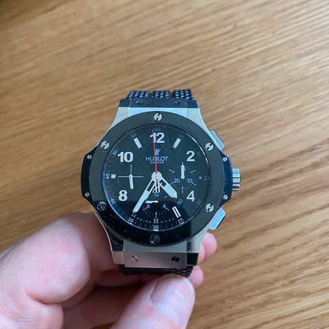 Hublot Big Bang 44 Chronograph Diamonds 1,78 karat, reference 301.SX.130.RX.114, stålskall 44 mm, sort urskive, safirglas, automatisk schweizisk urværk, sort gummiarmbånd, håndledsmål ca. 21 cm, lunette med 114 diamanter i alt ca. 1,78 ct, fremstår i særdeles god stand med meget let slitage, ingen original æske eller papirer, leveres med rejsetaske og ægthedscertifikat fra De Horlogemeesters, forsikret forsendelse. Klik på den blå "gå til varen" knap, for at købe eller byde på denne vare. Den samlede pris vil blive vist inden du afgiver dit bud.