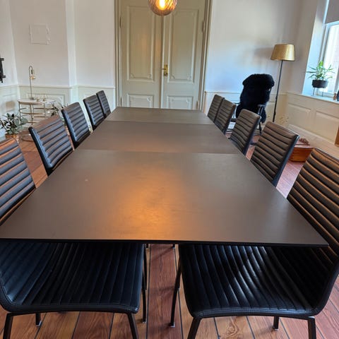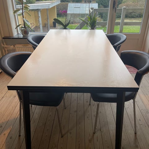 Spisebord sælges flot stand. Længde 200. Dybde 100 cm. Ekstra plader medfølger 2 styks så bord kan blive 250 eller 300 cm. langt. Ekstra Bordplader opbevares i bordet. 2 støtteben følger med som skal bruges når bordet har ekstra plader i. Og derfor er 3 meter langt. Laminat bordplade. Nypris 9000 kr. Købt i seet and sleep.