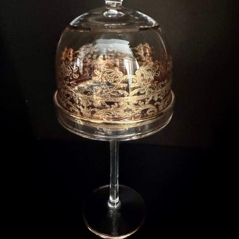 En række sjældne skønheder vil blive præsenteret ved mine auktioner. For jer og for at give alle mulighed for at røre ved det ægte luksus fra made in Italy, præsenterer jeg denne opbevaringsskål med en gylden klokke. Den har en lang, slank stilk og rejser sig som en stor, delikat kop, med en kant i 24 kt guld, der perfekt omfavner dens høje, blæste klokke, omhyggeligt indgraveret med pantograf og dekoreret med rige, vævede venetianske broderier på en antik rosa baggrund. Alt er raffineret, skinnende, elegant, og det magiske, lydende krystalglas vil fremhæve en magi på dit bord hver gang, du åbner den. Ideel som kage-, macaron-, småkage- eller chokoladeopbevaring, eller til røgning af dyrebare fødevarer.