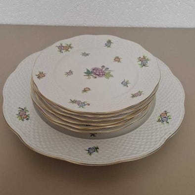 En af de mest anerkendte designs af Herend-porcelæn. Diameteren på tallerkenerne er 28+30 cm, og højden er 3 cm.