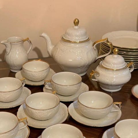 Raffineret te-sæt fra Rosenthal, model Sanssouci Oro, fremstillet i fineste porcelæn med karakteristisk reliefmønster i biscuit-effekt, typisk for Rosenthal-traditionen.