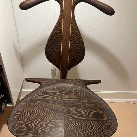 Jakkens Hvile fra PP Møbler er en funktionel skulptur, der anvender den traditionelle funktion af et kammertjenerstativ på en kunstfærdigt udformet træstol.
