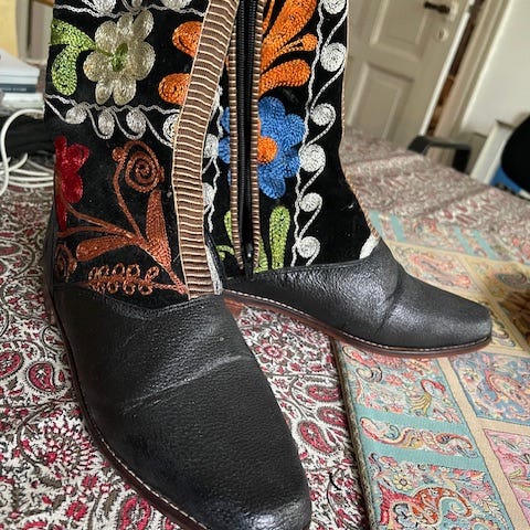 Støvler i størrelse 38 med broderi på ydersiden. Støvlerne er sorte og har en høj skaftdesign, der dækker op til knæet. Materialet fremstår som ruskind eller lignende tekstur med dekorative detaljer, der tilføjer et unikt udseende.