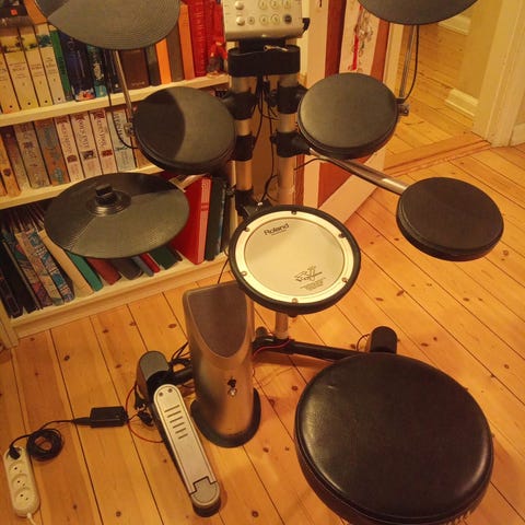 Roland TD-1K elektronisk trommesæt med trommestikker. Defekt strømstik. Kan muligvis laves, men kan sagtens bruges uden.