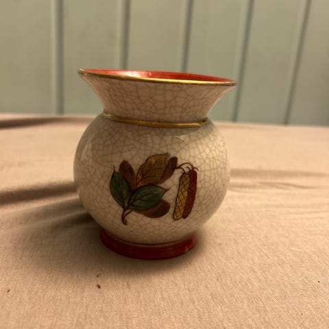 Sød lille vase med med motiv af en blomst. Vasen er lavet så den ligner at den er krakeleret.