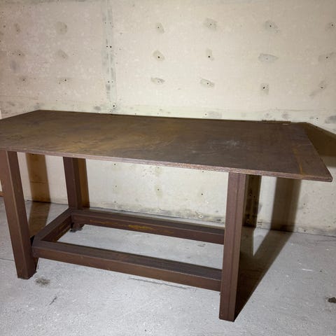 Arbejdsbord med kobberplade og robust metalstel. Bordet har en solid konstruktion og egner sig til forskellige typer arbejde, der kræver en stabil overflade.