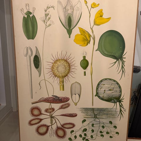 Botanisk plakat med detaljerede illustrationer af blomster og løg. Plakaten viser forskellige stadier og snit af planter, herunder blomsterhoveder og rodstrukturer. Velegnet til undervisning eller dekoration.