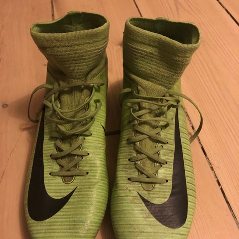 Nike fodboldstøvler i størrelse 42, designet til indendørs fodbold. Støvlerne er sorte med hvide og gule detaljer og har en gummisål egnet til indendørs baner. Fremstillet i Vietnam.