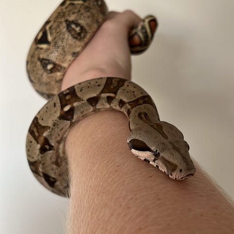 Han er mega sød at have ude og har aldrig gjort tegn til at bide er meget medgørlig og elsker at være ude af terrariet.