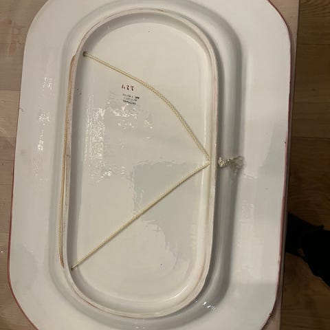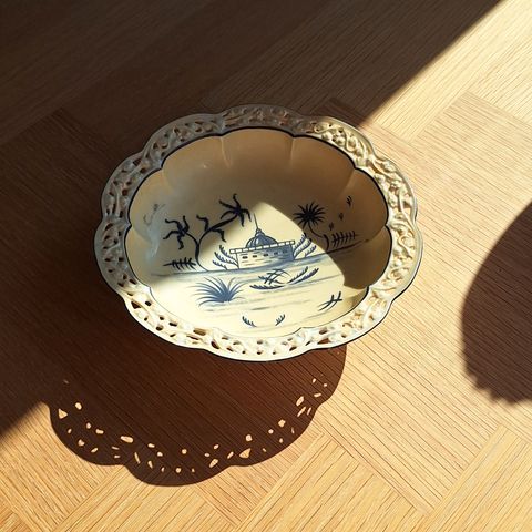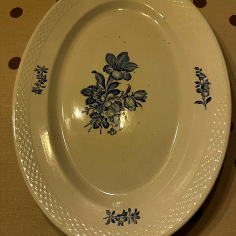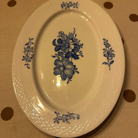 sært fascinerende fad med påsprayet motiv. En meget bred alle med blomstrende marker til begge sider, en skov og fugleflok for oven. Prikken over i'et er manden med trillebøren, der ganske umotiveret skråer henover alleen - hvorfor?