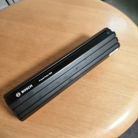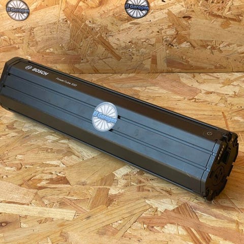 Bosch PowerTube 500 elcykelbatteri med en kapacitet på 500 Wh. Batteriet er sort og designet til at integreres i elcykler. Inkluderer oplader med tilhørende kabler.