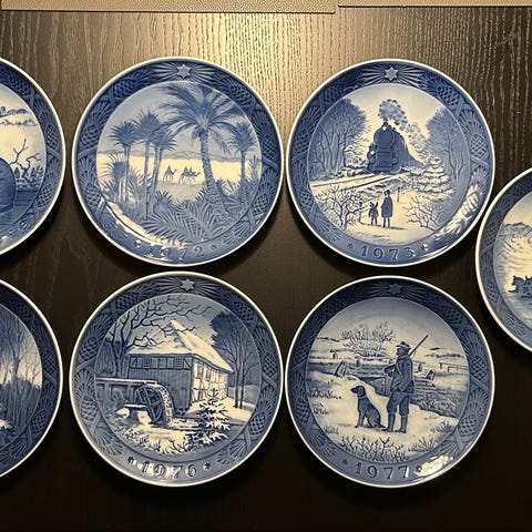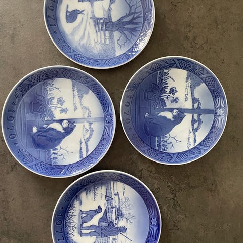 Royal Copenhagen Juleplatte tallerken i blå og hvid porcelæn. Tallerkenerne har julemotiv og er velegnede til samling eller til brug ved særlige lejligheder i julen.