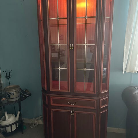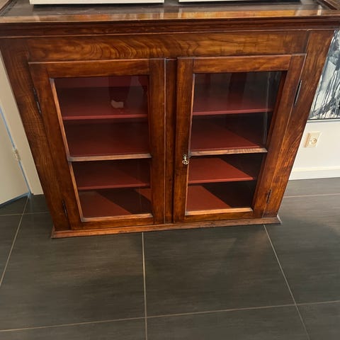 Mahogni vitrineskab med to glaslåger øverst og to trælåger nederst. Skabet har en klassisk design med plads til opbevaring og udstilling af service eller dekorative genstande.