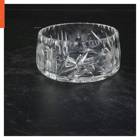 En krystalskål med en diameter på 16 cm. Skålen har et indviklet mønster og klare overflader. Bunden har et stjernemønster, og siden viser et rutet design.