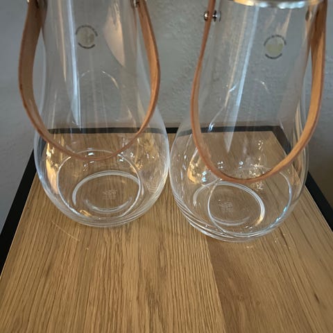 Glasvase med læderhank fra Holmegaard (str. Ø 12,5 cm længde 11,5 cm)