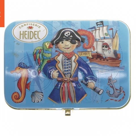 Denne blikæske har et piratmotiv og måler 11,5x8 cm. Æsken har en blå farve med tegninger af en pirat, papegøje og skib. Den er lavet af metal og har låsefunktion. Indeholder et sæt mini bowling udstyr med 8 kegler og en kugle