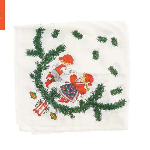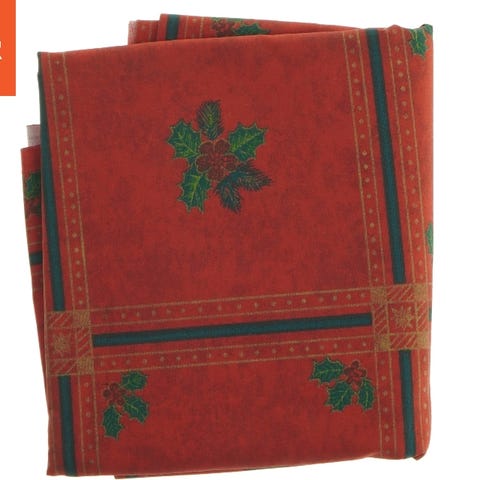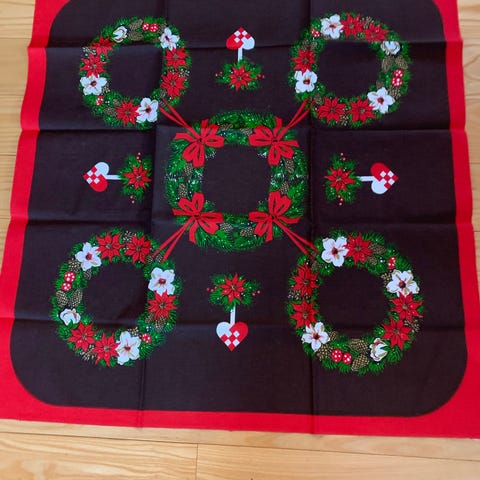 Dugen er fremstillet i stof og måler 92x82 cm. Den har et festligt julemotiv med tryk af lys, grankvister og hjerter på en orange baggrund, hvilket gør den ideel til juleborddækning.