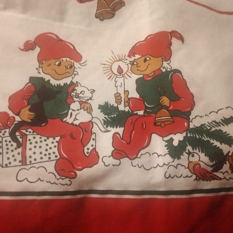 Juledug der har et farverigt motiv af en nisse i rød og grøn dragt, med en kat på skødet. Stoffet er dekoreret med grankviste og små røde hjerter, samt en lille klokke i et hjørne. Størrelsen er 110x130 cm, hvilket gør det velegnet til juledekorationer eller som et tekstiltæppe. Det er perfekt til brug i dekorationer til juleperioden eller som gaveindpakning.