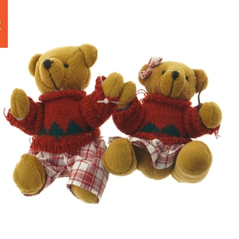 5 søde små tøjdyr: en brun bjørn, en beige sabeltiger, en brungul surikat, en lille brun bjørn med sløjfe, og en flettet foderkugle. Tøjdyrene varierer i størrelse fra 6 til 13 cm og er lavet af bløde materialer.