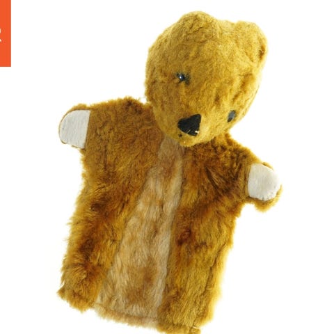 Hånddukke formet som en måge, klædt i en blå-hvid stribet skjorte. Dukken er lavet af blødt materiale med en gul næb og sorte detaljer ved øjnene. Perfekt til teaterforestillinger for børn eller som en unik dekorationsgenstand. Dukken er 23 cm stor.