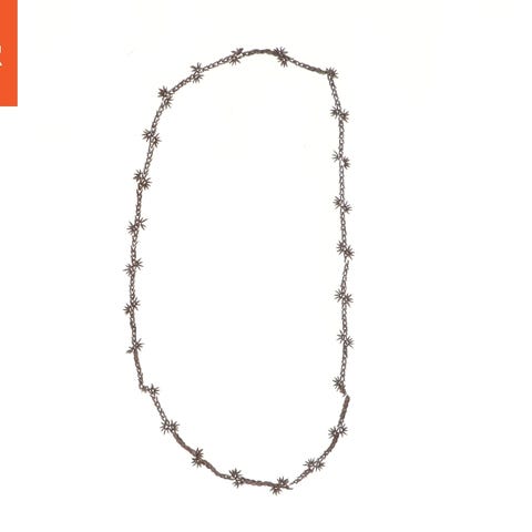 Denne kæde er lavet af flere sammenflettede kæder med en længde på 90 cm. I midten hænger en kubisk vedhæng pyntet med krystaller på alle sider, hvilket giver et skinnende og elegant udtryk. Den overordnede stil er moderne med et antydning af vintage charme.