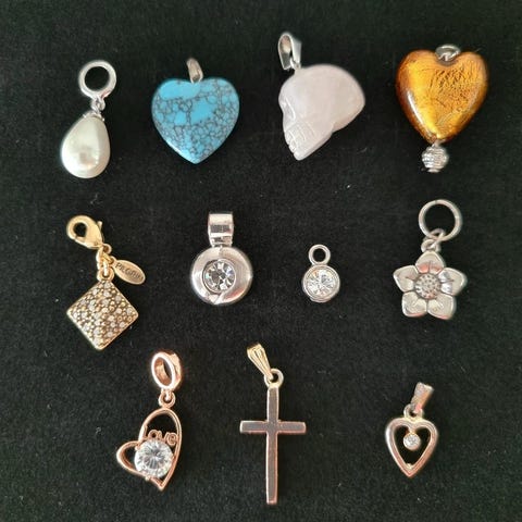 To smykkedele, sandsynligvis charms til armbånd. Den ene er cirkulær med en diameter på ca. 1-1,5 cm og er prydet med krystaller eller rhinsten. Den anden har en blomstret design og er buet. Begge emner er sølvfarvede og har et enkelt design som egner sig til smykkeprojekter såsom armbånd og halskæder.