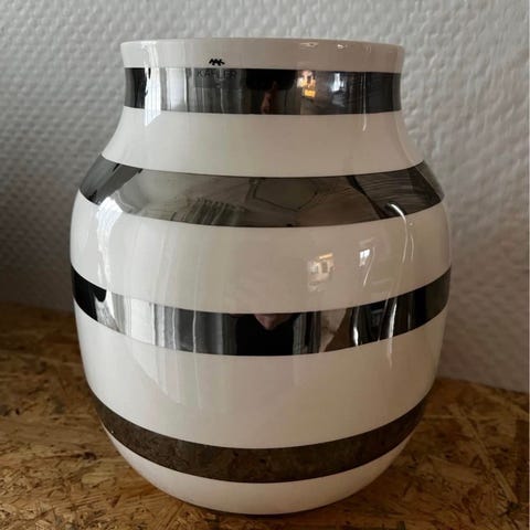 Denne vase er fra mærket Kähler og har en højde på 21 cm. Vasen har en hvid basefarve og er dekoreret med sorte horisontale striber, der giver den et moderne og stilrent look.
