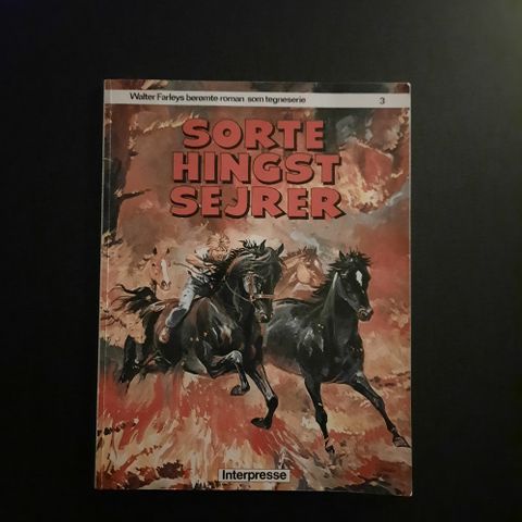 Sorte Hingst Sejrer er en bog med illustrationer, der viser sorte hingste i bevægelse med en baggrund af ild. Bogen har en dramatisk og farverig forside med fokus på heste.