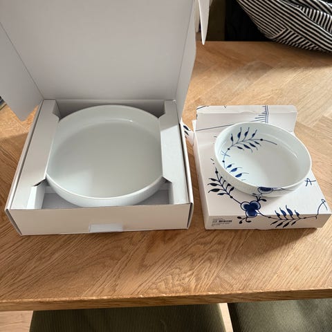 Royal copenhagen fadsæt med et fad på 28 cm og et på 35 cm. Det store er hvidriflet og det mindre er mega mussel