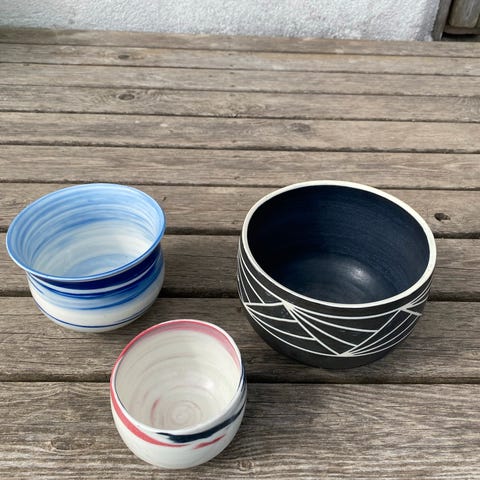 3 små skåle i keramik i flotte blå nuancer. Signerede Christa - Christa Julin.