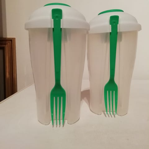 Yoghurtbæger, Madkasse til f.eks. frugt eller yoghurt med separat del til f.eks. müsli. 2 stk. haves. Pris pr. stk. 10 kr.