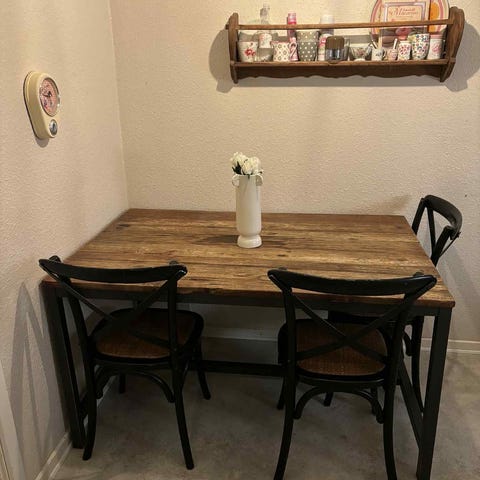 Sættet har et robust, rustikt design med en varm, oliebehandlet træbordplade.