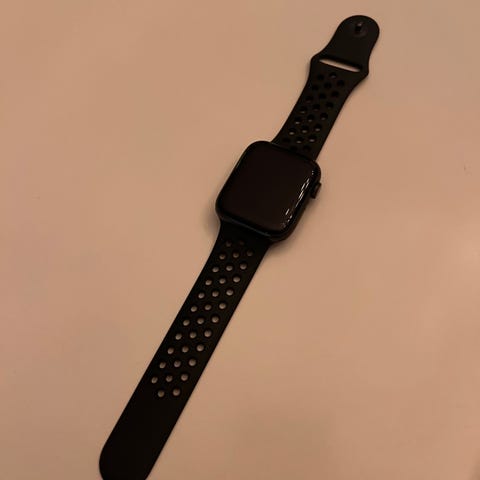 Apple Watch Series SE med 40 mm aluminium etui. Uret har en sort rem og leveres med ekstra remme i forskellige materialer og farver. Uret har indbygget Wi-Fi og Bluetooth, og kører watchOS version 10.6.1.