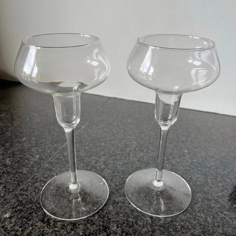 12 stk massive glas lysestager, kan bruges både til høje lys og fyrfadslys, da der er lille hul i den ene ende og hul til fyrfadslys i den anden ende.
