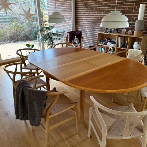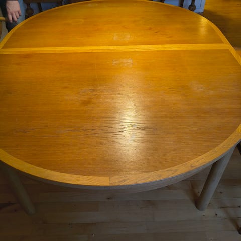 Sælger dette BM Øresund spisebord med to tillægsplader som kan ligge i bordet. Det har nogle dings og kunne godt bruge en opfriskning men så har man også en klassiker der holder i mange år. Vi har ikke lige overskud til det.